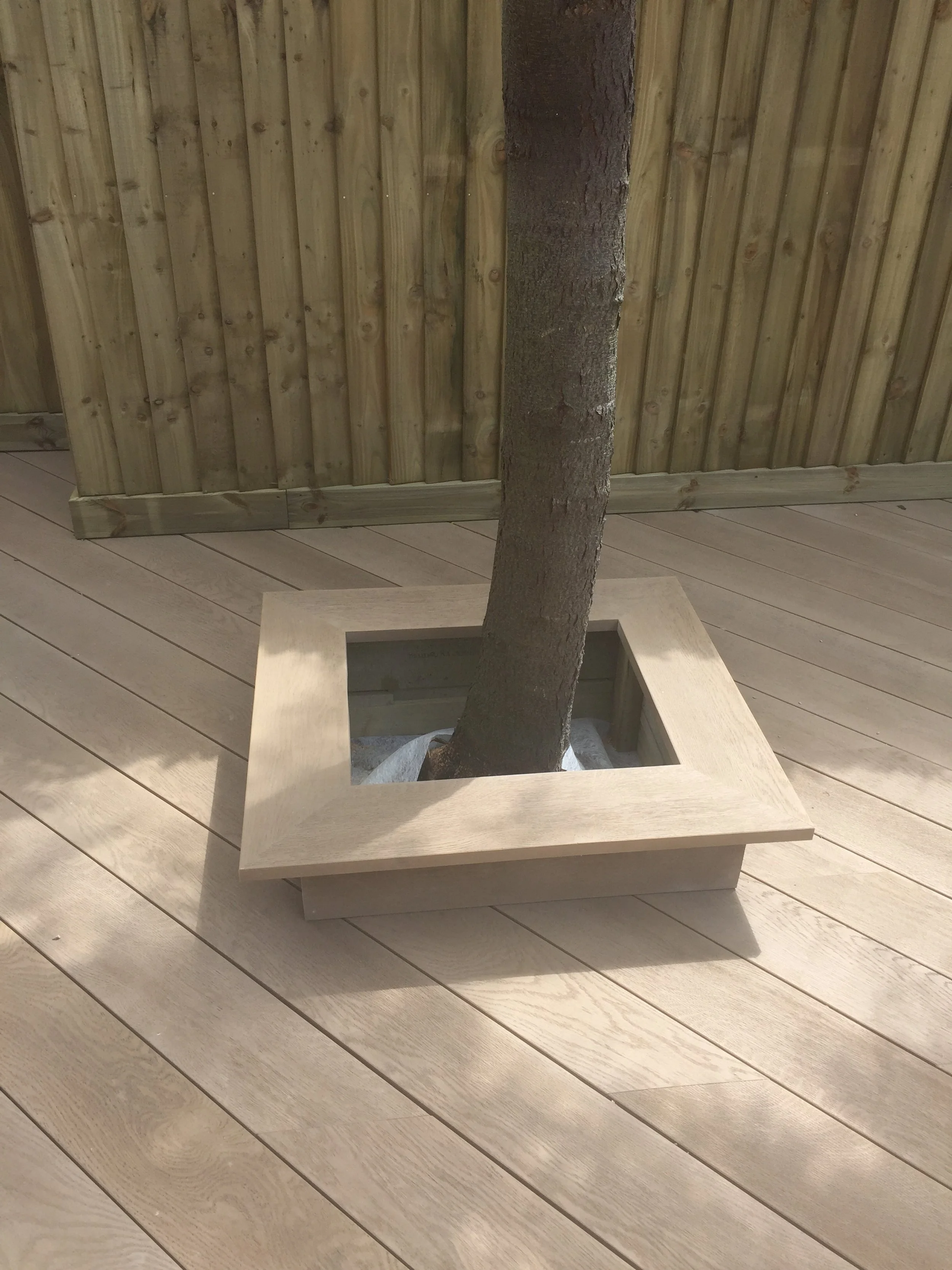 Millboard decking designed around garden tree