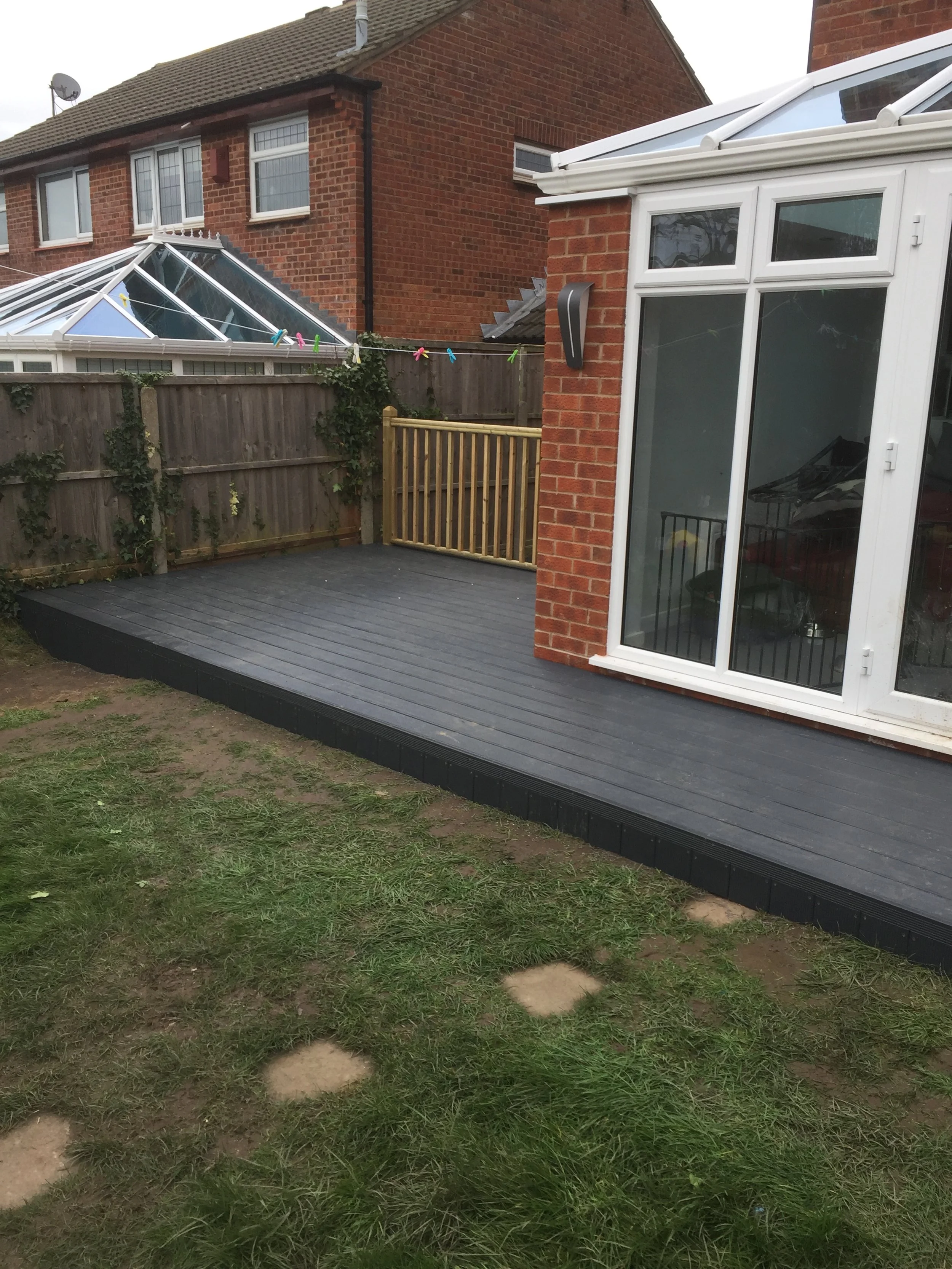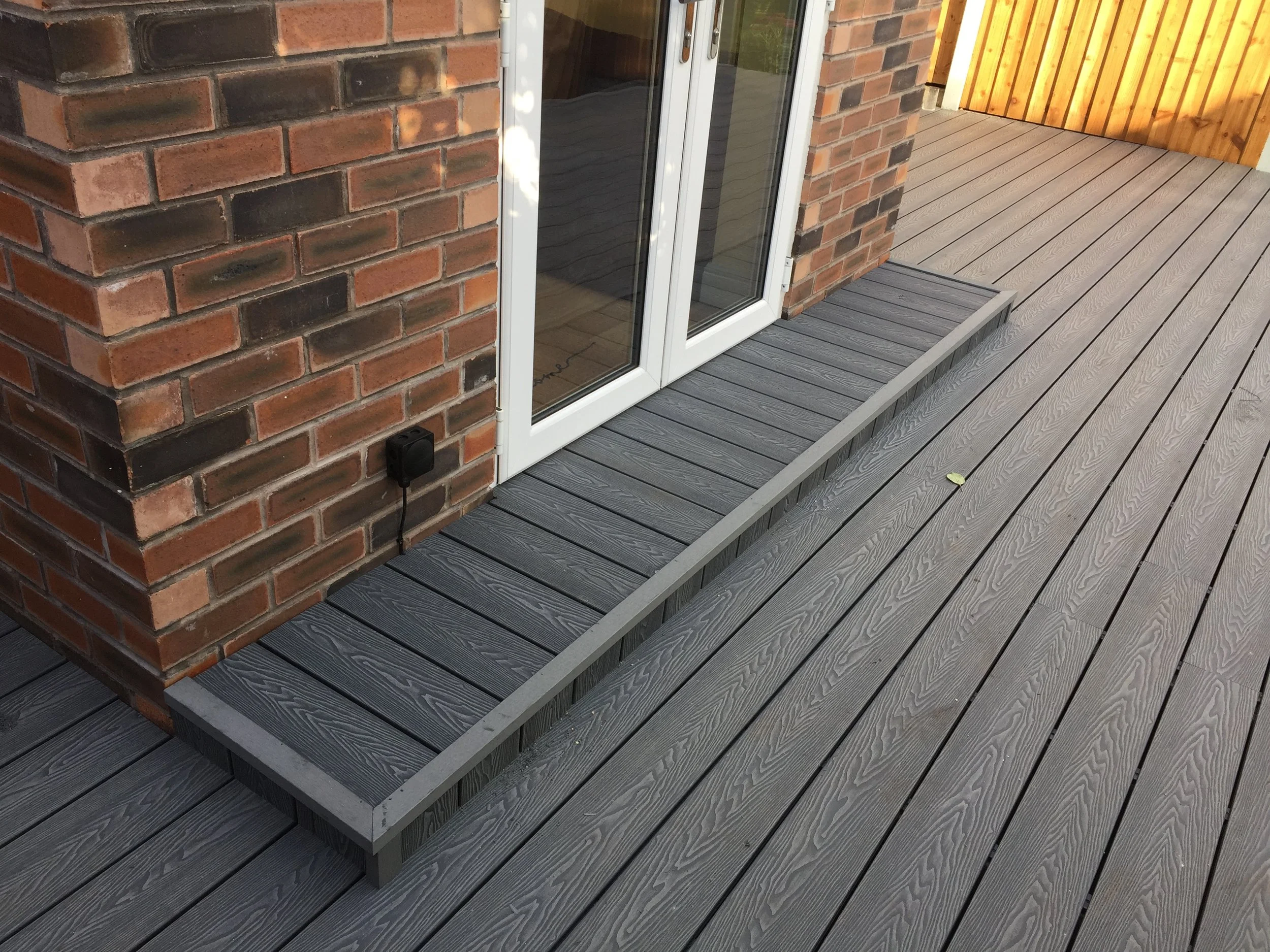 Small, black millboard composite decking directly outside back door