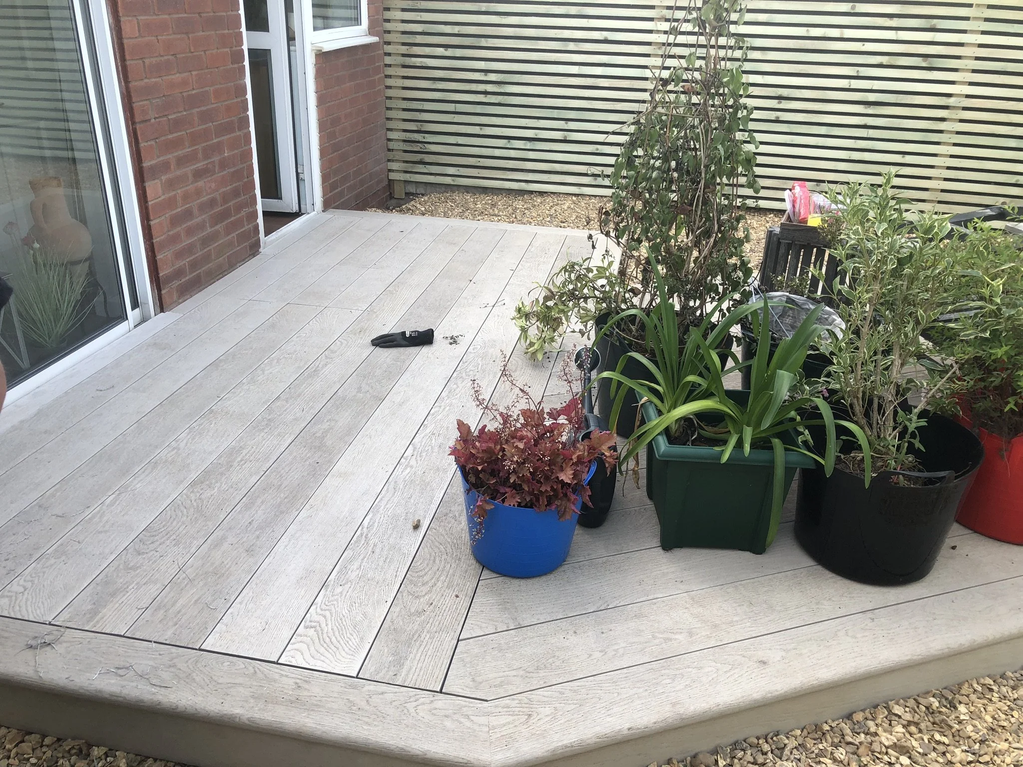 Small composite decking with decorative plant pots