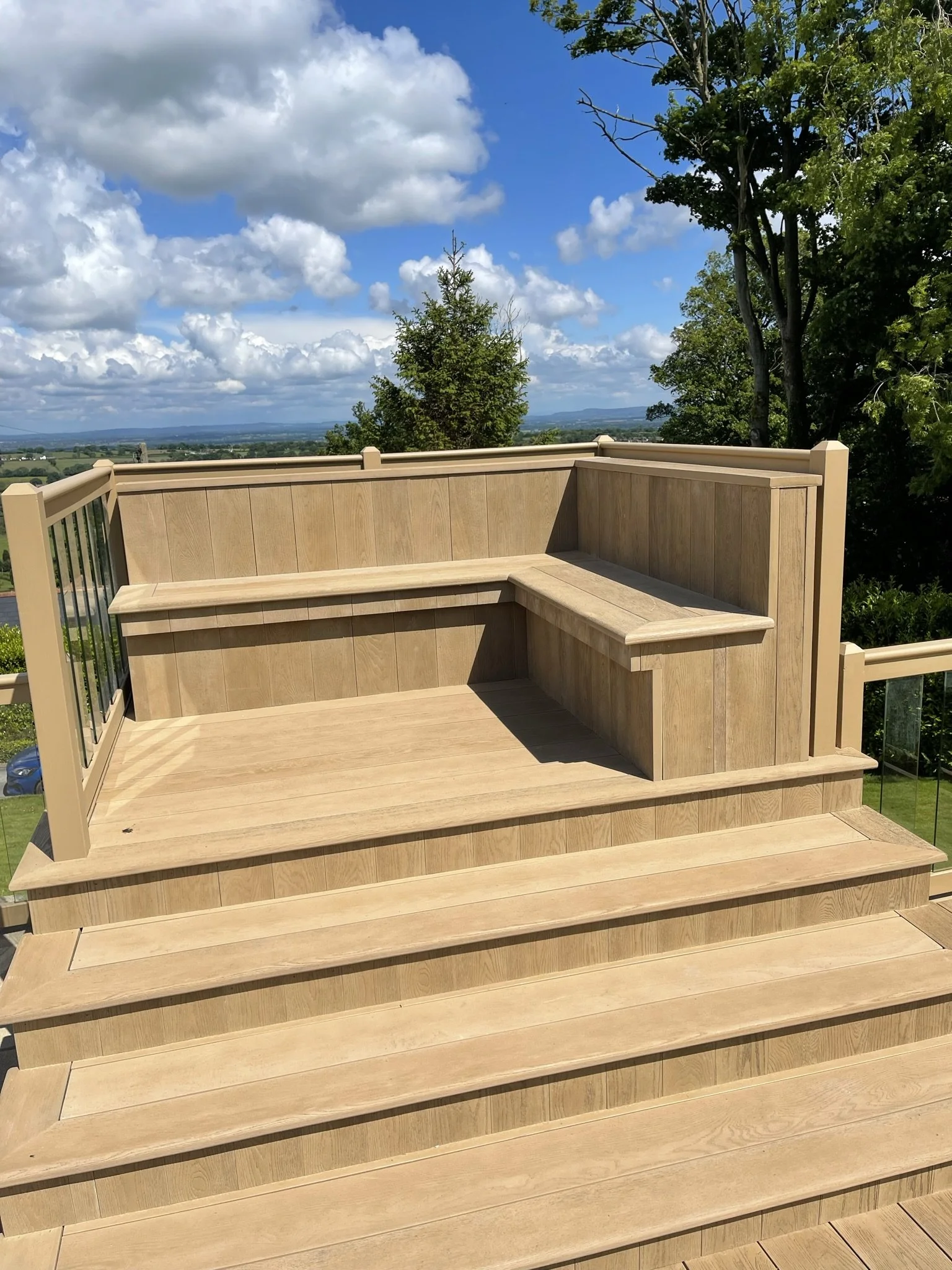 Composite decking with built-in balcony and seating area