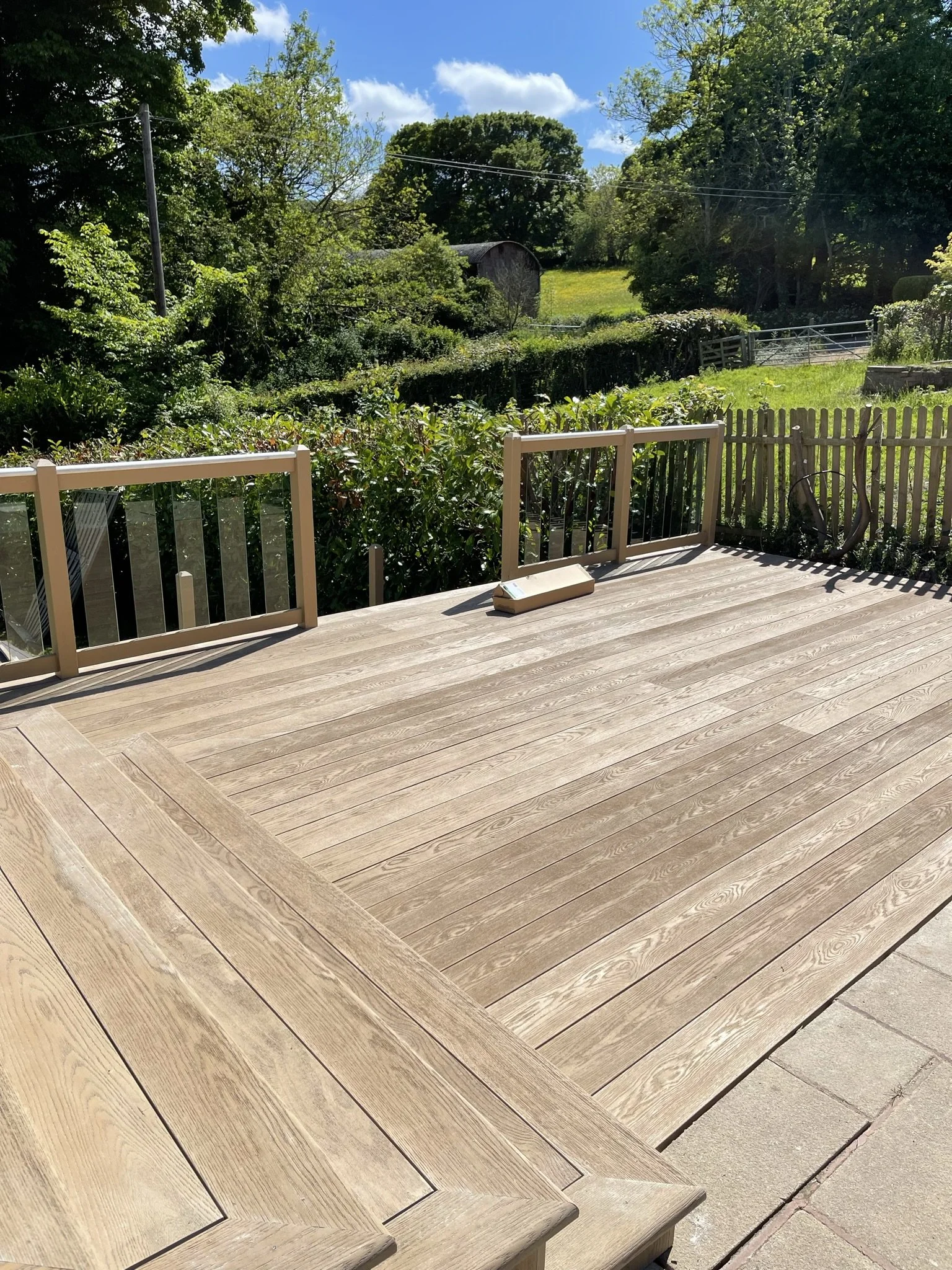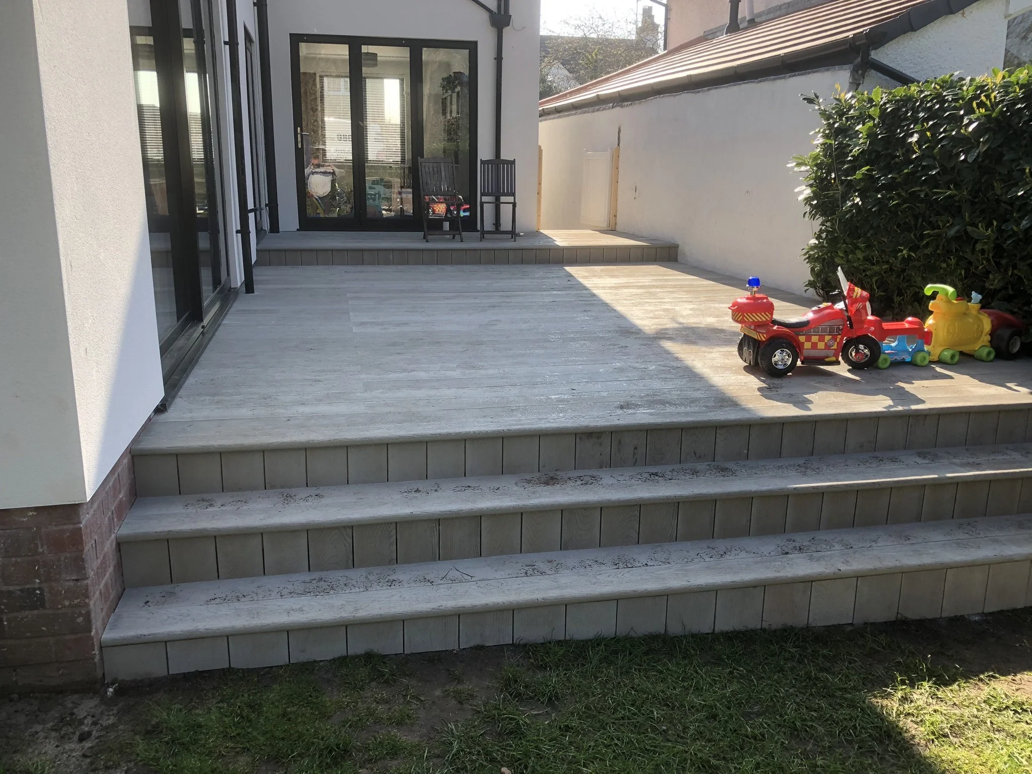 Large grey decking leading into garden
