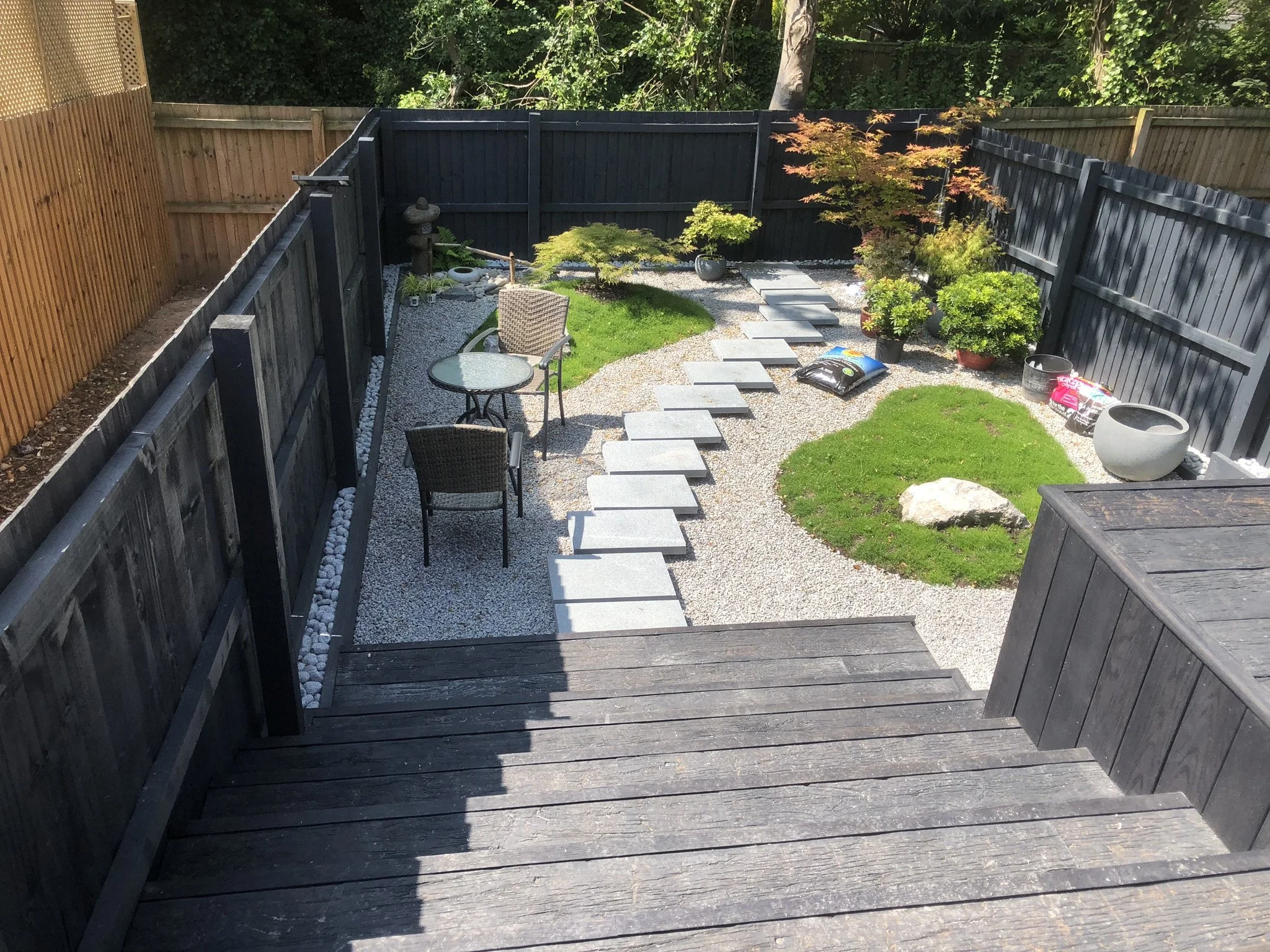Dark grey composite decking stairs leading into modern garden