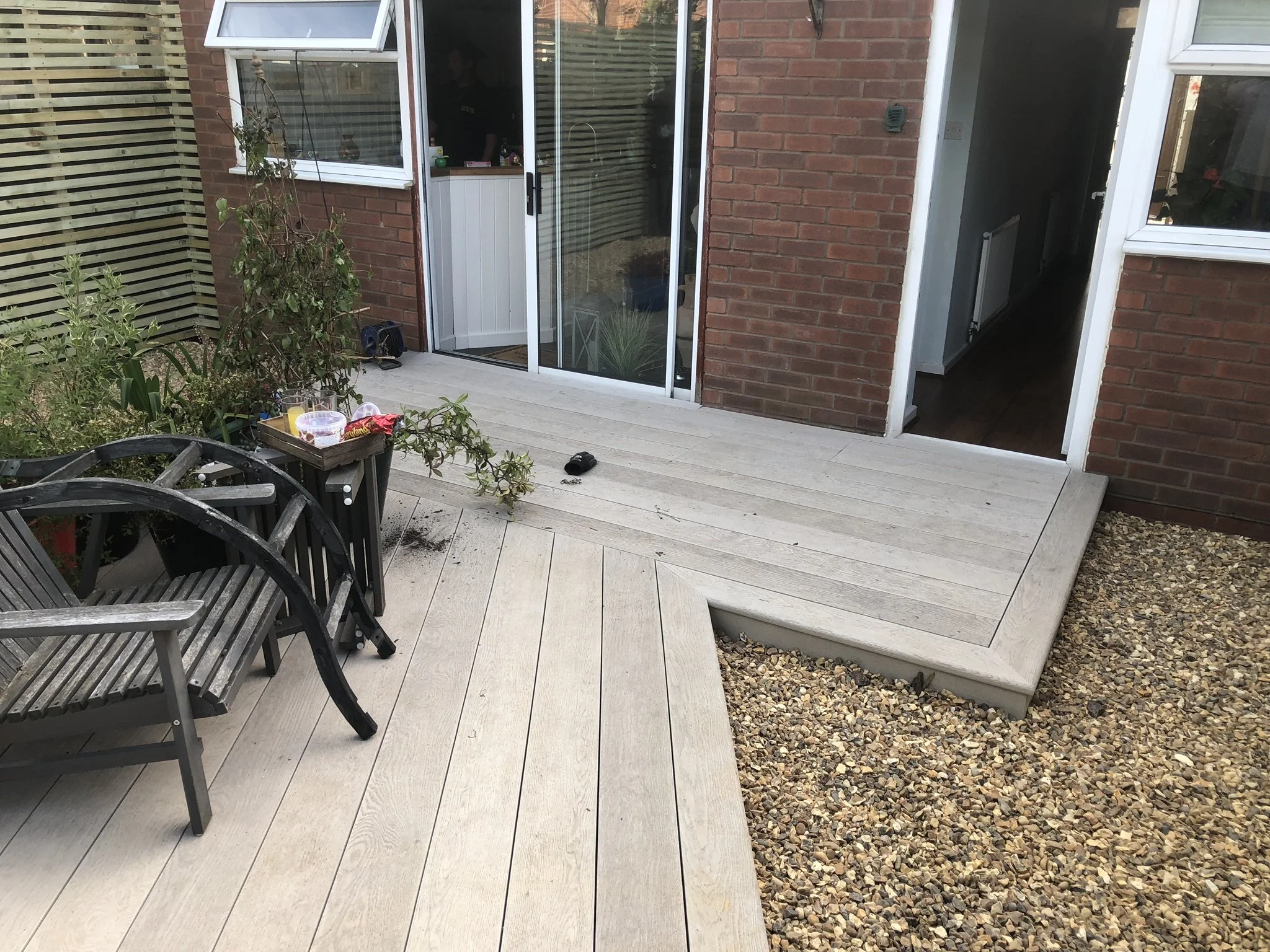Grey composite decking with built in bench
