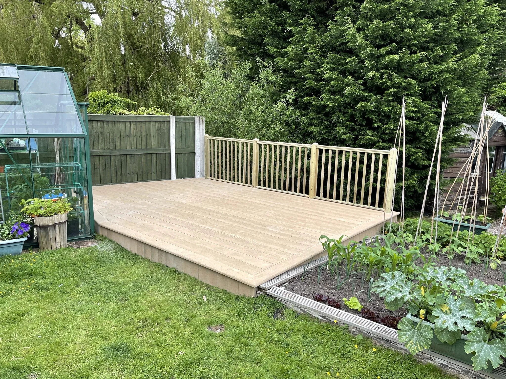 Small composite decking in corner of the garden