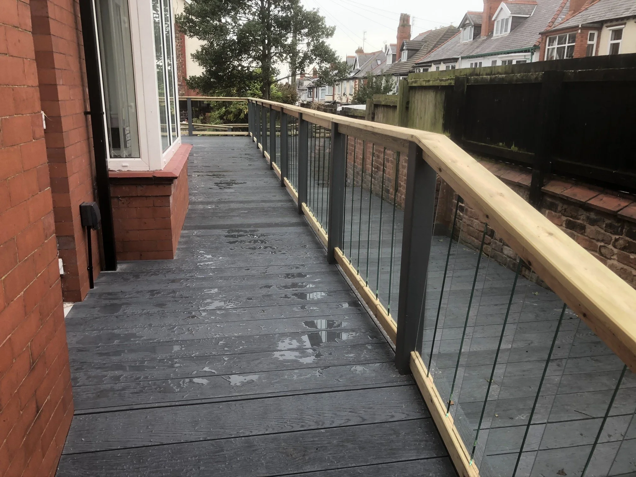 Dark composite decking with glass fencing